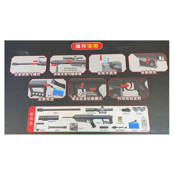 - دارای : دوربین قابل نصب و تنظیم زوم و لیزر جانبی، 12 بسته تیر ژله ای (500 عدد هر بسته)، کابل شارژ USB، بند کمری و عینک محافظ
