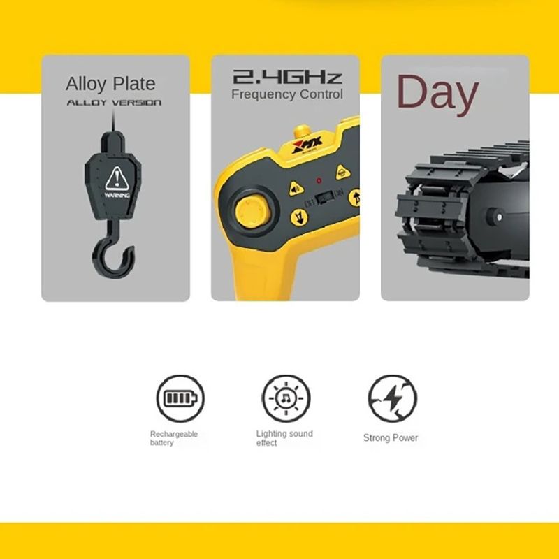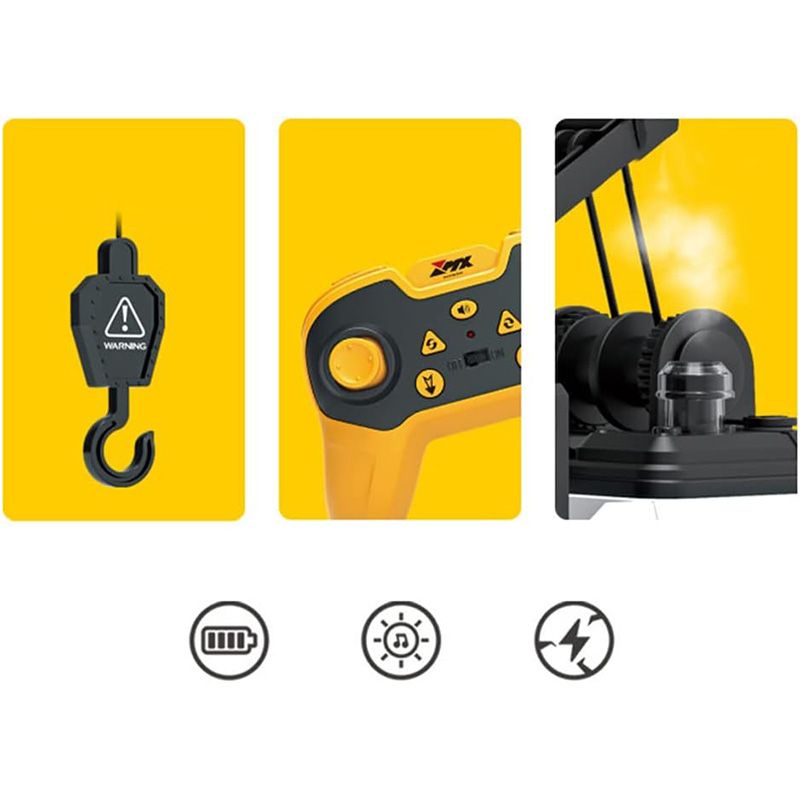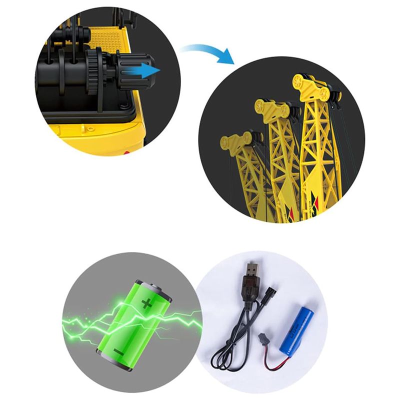 باتری قابل شارژ 3.7 ولت و ریموت کنترلی این جرثقیل با فرکانس 2.4G از دو عدد باتری قلمی 1.5 ولت تغذیه می گردد.
