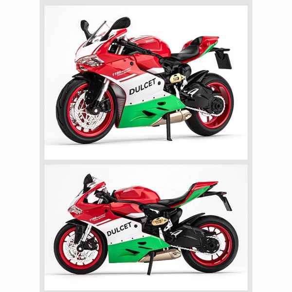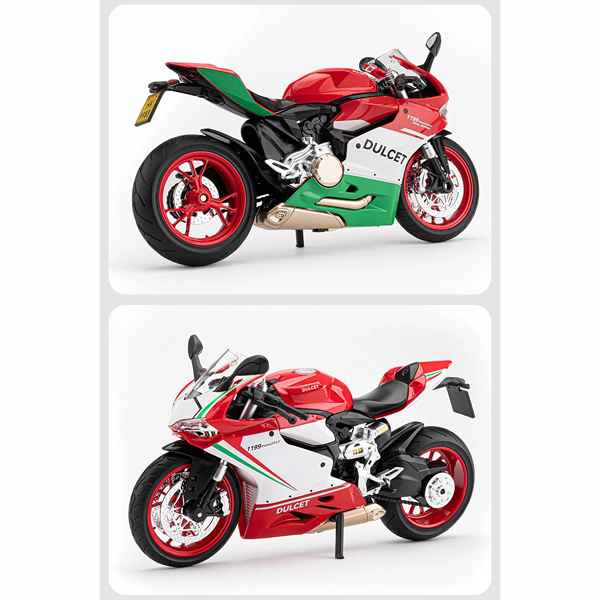 ماکت موتور فلزی دوکاتی 1199 جیای کد 12013 با مقیاس 1:12، نمونهای باکیفیت و دقیق از یکی از مشهورترین موتورسیکلتهای دوکاتی است. جزئیات ظاهری این مدل را با دقت بسیار بالا شبیهسازی کرده و با استفاده از مواد باکیفیت ساخته شده است. باک این ماکت از جنس فلز بوده و دیگر قطعات آن از پلاستیک مقاوم طراحی شدهاند تا ضمن حفظ جزئیات، دوام بالایی داشته باشند.یکی از جذابیتهای این ماکت، وجود بخشهای متحرک است که حس واقعی بودن را به شما القا میکند. فرمان و جک این ماکت قابلیت حرکت دارند و همچنین کمکفنر عقب نیز به صورت متحرک طراحی شده است که جلوهای پویا به محصول میبخشد.این ماکت علاوه بر طراحی بینظیر، دارای چراغهای روشنشونده در جلو است که ظاهری واقعیتر به آن میدهد. همچنین قابلیت پخش موزیک از دیگر ویژگیهای جذاب این ماکت است که آن را به یک محصول خاص برای علاقهمندان به موتورسیکلت تبدیل میکند.