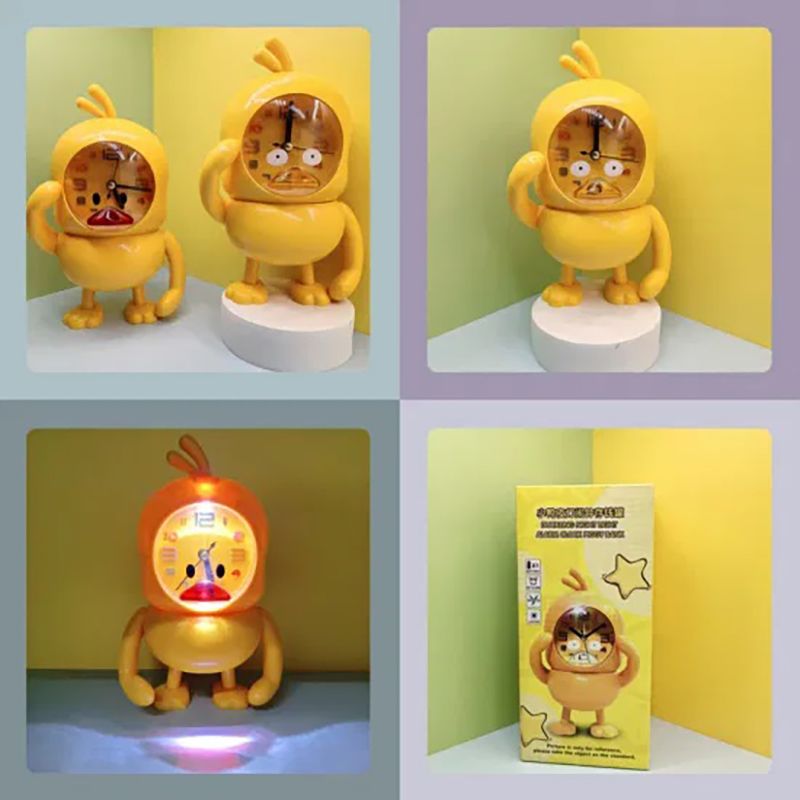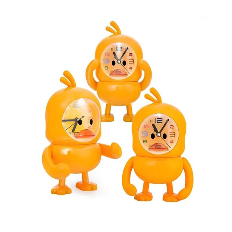 ساعت رو میزی بچگانه با طرح زیبا و جذاب جوجه اردک دارای رنگ زرد با چشمان مشکی می باشد که به راحتی روی میز تحریر یا مکان های دیگر قرار می گیرد. صفحه این ساعت گرد است و با زمینه رنگی و طرح جوجه اردک با شماره های رنگی کار شده است. دو پیچ پشت ساعت قرار گرفته که یکی برای تنظیم عقربه های ساعت و دیگری برای تنظیم آلارم ساعت می باشد.