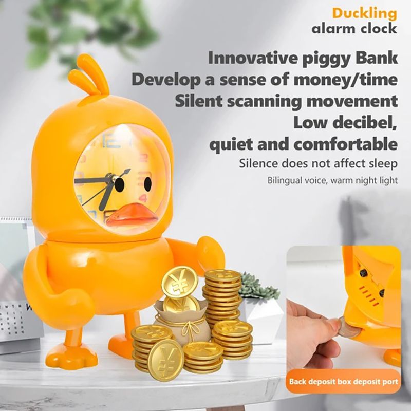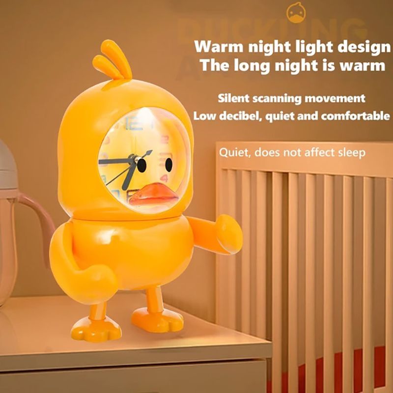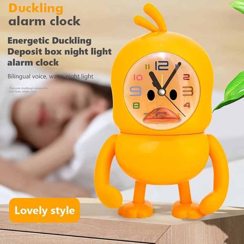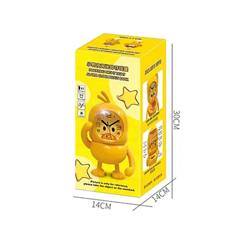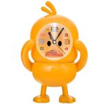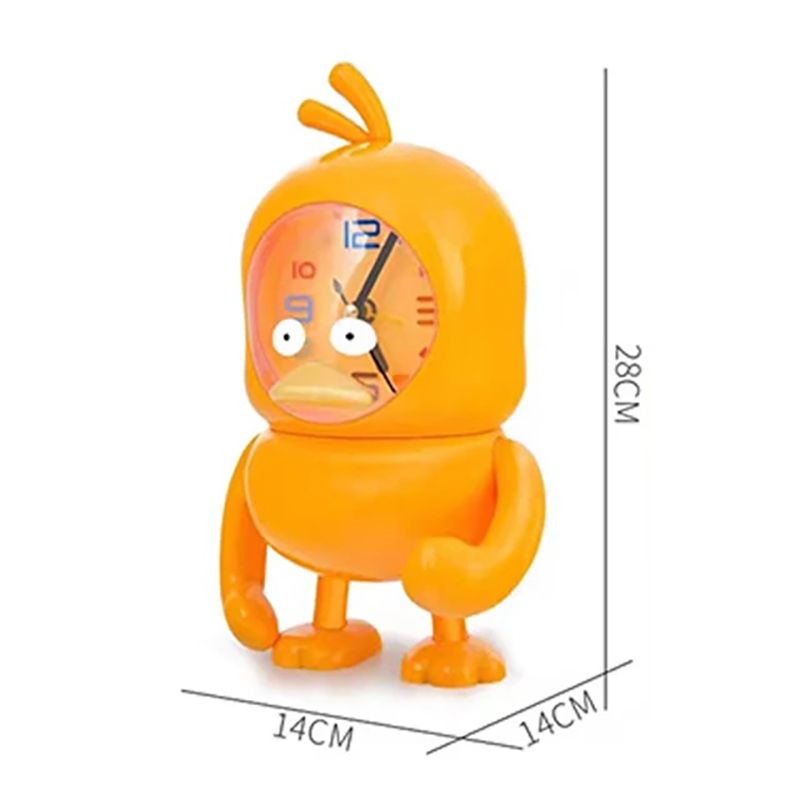 ساعت رو میزی بچگانه با طرح زیبا و جذاب جوجه اردک دارای رنگ زرد با چشمان مشکی می باشد که به راحتی روی میز تحریر یا مکان های دیگر قرار می گیرد. صفحه این ساعت گرد است و با زمینه رنگی و طرح جوجه اردک با شماره های رنگی کار شده است. دو پیچ پشت ساعت قرار گرفته که یکی برای تنظیم عقربه های ساعت و دیگری برای تنظیم آلارم ساعت می باشد.