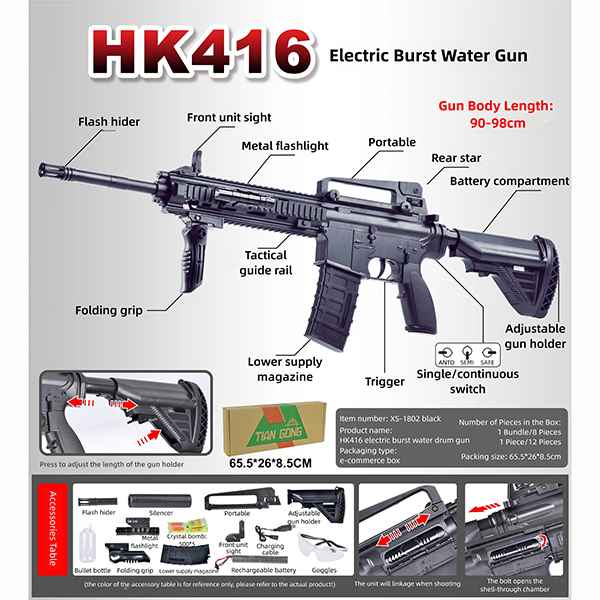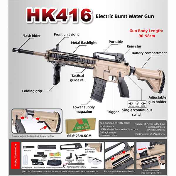تفنگ اسباب بازی تیر ژله ای یک اسباب بازی مبارزه ای است. قدرت بی‌اندازه در دستان شماست، فقط کافی است ماشه را بکشید تا در دل یک مبارزه سالم و بی‌خطر حریفانتان را شکست دهید! کودکان می‌توانند با طراحی منحصر به فرد این تیرها با اطمینان به حریف خود شلیک کنند،تفنگ بازی شارژی تیر ژله ای سری HK کد HK416-XS1802 مانند نمونه واقعی از سری تفنگ های اسباب بازی سری HK می باشد. تفنگ بازی شارژی تیر ژله ای سری HK کد HK416-XS1802 دارای یک خشاب جداشونده با قابلیت نگهداری 40 تیر ژله ای است که با هر بار شلیک، یکی از آن‌ها تا برد 25~10 متر پرتاب می‌شود. برای تیراندازی باید دکمه زیر ماشه را نگه داشته و همزمان ماشه را فشار که هم بصورت تک تیر و رگباری قابل تیراندازی می باشد. تیرهای این تفنگ از جنس ژله ای(یا کریستال) هستند که کاملاً بی‌خطراند که ابتدا می بایست تیرها یا گلوله های کریستالی در آب خیس کنید و پس از انبساط کامل، گلوله های کریستال را در داخل خشاپ پر نمایید که این اسباب بازی در داخل جعبه تیرهای اضافی دارد که پس از تیراندازی گلوله های ژله ای در اثر ضربه شکافته و آب می شوند که کاملا داری ایمنی و اصلن مضر نمی باشند.باطری های این تفنگ قابل شارژ می باشند. خشاب این اسباب بازی از نوع بلند و الکترومغناطیسی می باشد.این تفنگ با طول بدنه 89 سانتی‌متر و وزن ۱.۸ کیلوگرم، تجربه بازی جذابی را ارائه می‌دهد و در عین حال خلاقیت و مهارت‌های حل مسئله را از طریق سرگرمی تعاملی در فضای باز تقویت می‌کند.