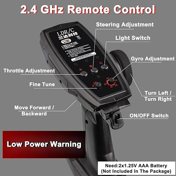 کنترل این ماشین از دو عدد باتری قلمی 1.5 ولت تغذیه می گردد که داخل جعبه موجود نمی باشد و باید جداگانه تهیه گردد.