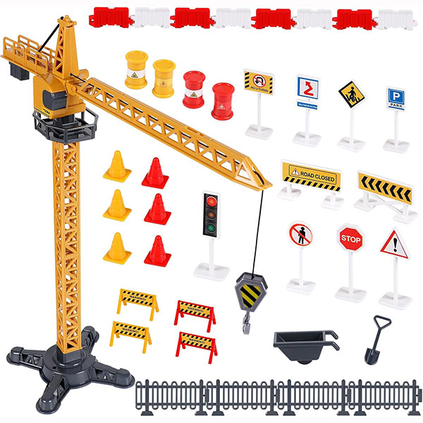 محتویات جعبه: این مجموعه اسباببازی شامل بیل مکانیکی، غلتک، بولدوزر، کامیون کمپرسی، میکسر بتن، لیفتراک، جرثقیل برجی، کامیون، آدمکهای کار، ابزارها، موانع ایمنی و علائم ایمنی است. یک مجموعه اسباببازی سرگرمکننده برای فرزندان شما