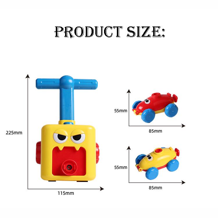 در بسته بندی این اسباب بازی یک تلمبه بادکنک و دو ماشین بازی بهمراه تعدادی بادکنک قرار دارد.این ست بازی احتیاجی به باتری نداشته و نیروی لازم برای به حرکت انداختن ماشین ها از طریق پمپ هوا و بادکنک تامین میشود